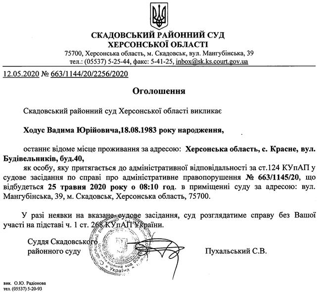Виклик до суду Ходус Вадима Юрійовича по справі №663/1145/20